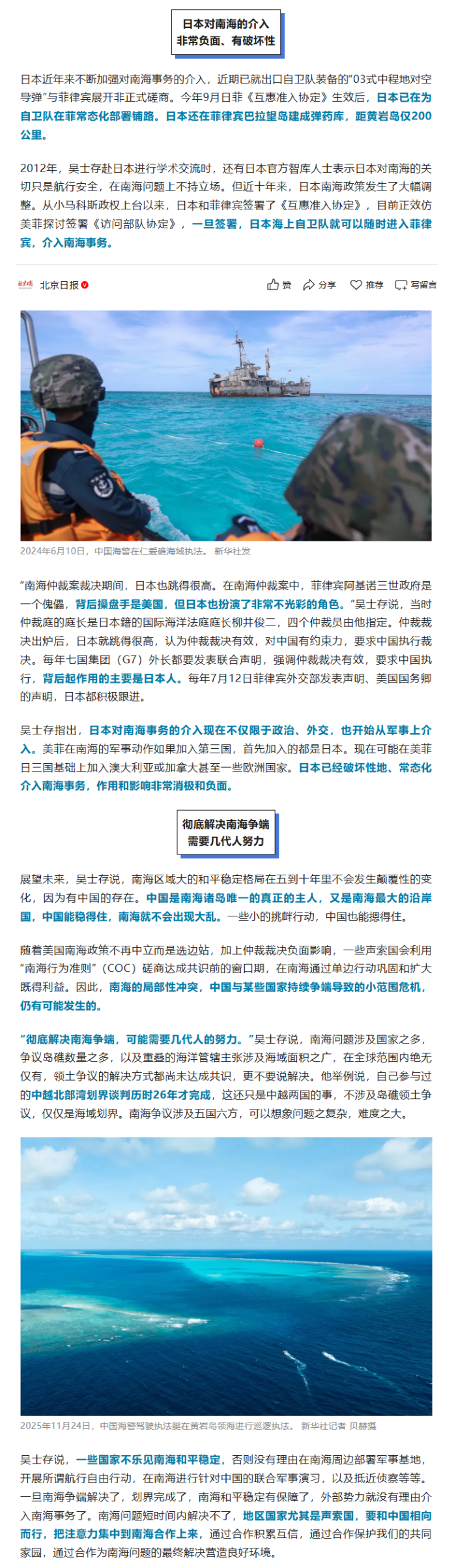近日在海南三亚举办的第六届“海洋劝诱与管制论坛”上,华阳海洋接头中样貌事长、中国南海接头院学术委员会主席吴士存收受北京日报记者专访时说,在好意思国救济和日自己分的影响下,菲律宾在南海岛礁的单边寻衅步履仍在加强。日本在南海问题上老是跳得很高、积极介入,产生了相当负面且有破损性的作用。往日五到十年南海和平通晓的大样式不会发生颠覆性变化,但澈底处分南海争端可能需要几代东说念主的长途。